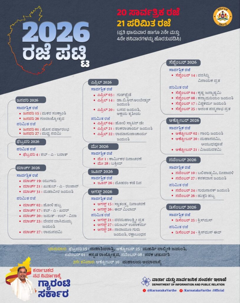 ಬೆಂಗಳೂರು: ಕರ್ನಾಟಕ ಸರ್ಕಾರಿ ನೌಕರರು ಮತ್ತು ಸಾರ್ವಜನಿಕರ ಬಹುನಿರೀಕ್ಷಿತ 2026ನೇ ಸಾಲಿನ ಸಾರ್ವತ್ರಿಕ ರಜಾ ದಿನಗಳ ಪಟ್ಟಿಗೆ ರಾಜ್ಯ ಸಚಿವ ಸಂಪುಟವು ಅನುಮೋದನೆ ನೀಡಿದೆ. ಶುಕ್ರವಾರ ನಡೆದ ಸಂಪುಟ ಸಭೆಯಲ್ಲಿ ಈ ನಿರ್ಧಾರ ಕೈಗೊಳ್ಳಲಾಗಿದ್ದು, ಹೊಸ ವರ್ಷದಲ್ಲಿ ರಾಷ್ಟ್ರೀಯ ಹಬ್ಬಗಳು, ಪ್ರಾದೇಶಿಕ ಹಬ್ಬಗಳು ಸೇರಿದಂತೆ ಒಟ್ಟು 20 ಸಾರ್ವತ್ರಿಕ ರಜಾ ದಿನಗಳನ್ನು ಘೋಷಿಸಲಾಗಿದೆ.